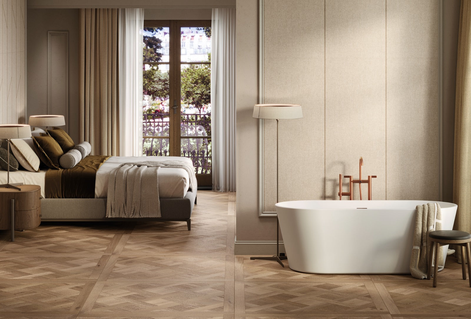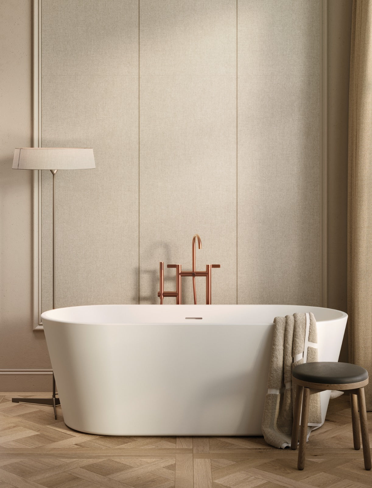 Part of Porcelanosa’s Tailor collection, Tailor Taupe features a soft linen-inspired texture with subtle surface movement, bringing warmth and quiet elegance to bathroom and interior walls. Its elongated 59.6×150 format enhances the sense of space and light, creating a refined, fabric-like backdrop in neutral taupe.